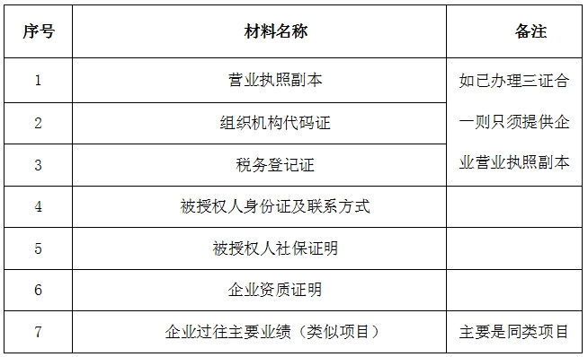 2、 凡有意向參加投標(biāo)者,請在上述期間內(nèi)按下表提供報名資料,相關(guān)證明文件的原件如無法提供原件則提供復(fù)印件加蓋公司公章,投標(biāo)人須將上述資料的掃描件發(fā)郵件至招標(biāo)聯(lián)系人處進(jìn)行報名。