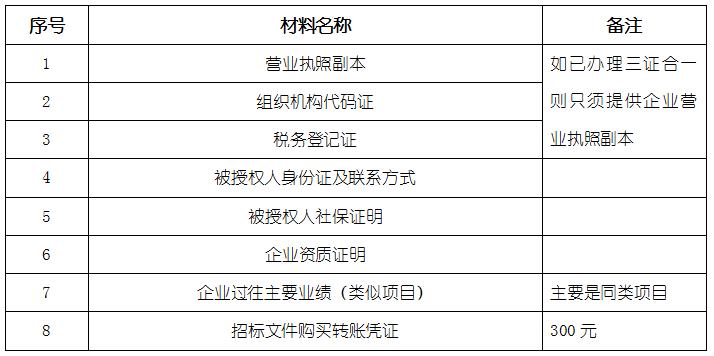 2、 凡有意向參加投標者,請在上述期間內(nèi)按下表提供報名資料,相關(guān)證明文件的原件如無法提供原件則提供復(fù)印件加蓋公司公章,投標人須將上述資料的掃描件發(fā)郵件至招標聯(lián)系人處進行報名。