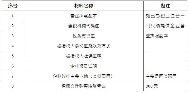 2、 凡有意向參加投標者,請在上述期間內按下表提供報名資料,相關證明文件的原件如無法提供原件則提供復印件加蓋公司公章,投標人須將上述資料的掃描件發郵件至招標聯系人處進行報名。