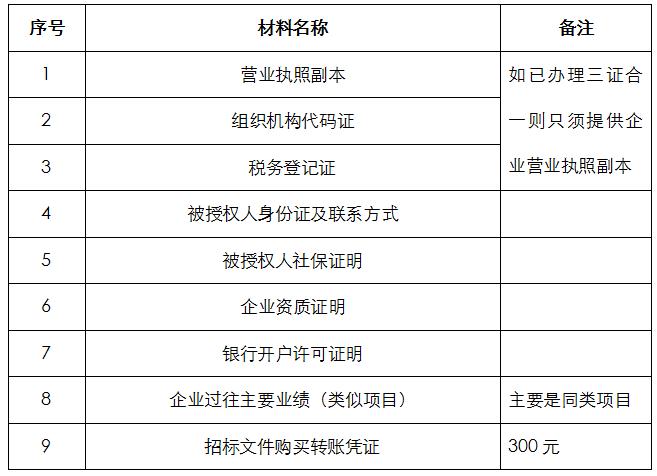 2、 凡有意向參加投標(biāo)者,請在上述期間內(nèi)按下表提供報名資料,相關(guān)證明文件的原件如無法提供原件則提供復(fù)印件加蓋公司公章,投標(biāo)人須將上述資料的掃描件發(fā)郵件至招標(biāo)聯(lián)系人處進(jìn)行報名。