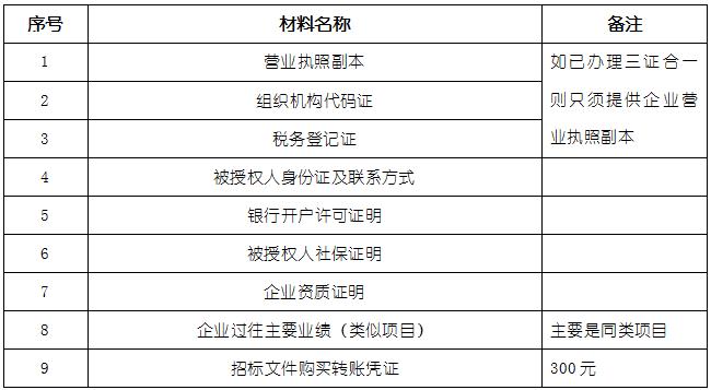 2、 凡有意向參加投標(biāo)者,請(qǐng)?jiān)谏鲜銎陂g內(nèi)按下表提供報(bào)名資料,相關(guān)證明文件的原件如無法提供原件則提供復(fù)印件加蓋公司公章,投標(biāo)人須將上述資料的掃描件發(fā)郵件至招標(biāo)聯(lián)系人處進(jìn)行報(bào)名。