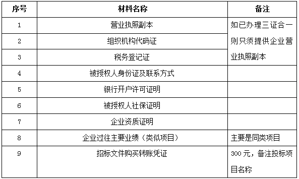 2、 凡有意向參加投標者,請在上述期間內按下表提供報名資料,相關證明文件的原件如無法提供原件則提供復印件加蓋公司公章,投標人須將上述資料的掃描件發郵件至招標聯系人處進行報名。