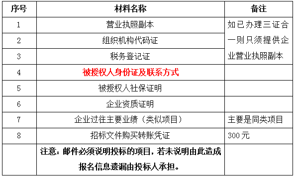 2、 凡有意向參加投標者,請在上述期間內按下表提供報名資料,相關證明文件的原件如無法提供原件則提供復印件加蓋公司公章,投標人須將上述資料的掃描件發郵件至招標聯系人處進行報名。