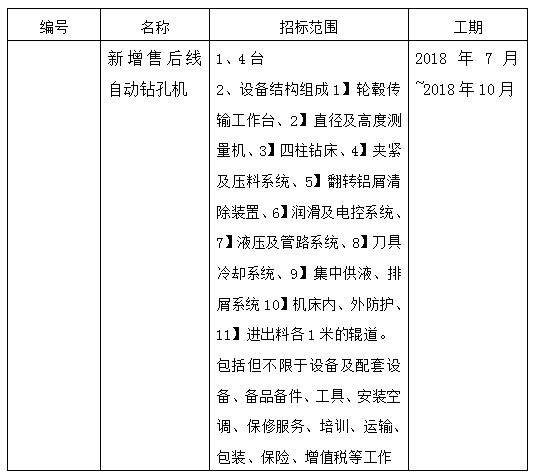 本招標項目 新增售后線自動鉆孔機(項目名稱)已批準建設,招標人為 大亞車輪制造有限公司,建設資金來自自籌 (資金來源)。項目已具備招標條件,現(xiàn)進行公開招標,特邀請有興趣的潛在投標人(以下簡稱申請人)提出資格預審申請。