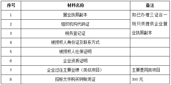 2、 凡有意向參加投標者,請在上述期間內(nèi)按下表提供報名資料,相關證明文件的原件如無法提供原件則提供復印件加蓋公司公章,投標人須將上述資料的掃描件發(fā)郵件至招標聯(lián)系人處進行報名。