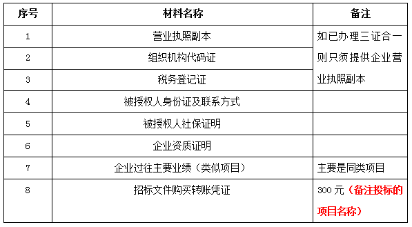 2、 凡有意向參加投標(biāo)者,請(qǐng)?jiān)谏鲜銎陂g內(nèi)按下表提供報(bào)名資料,相關(guān)證明文件的原件如無(wú)法提供原件則提供復(fù)印件加蓋公司公章,投標(biāo)人須將上述資料的掃描件發(fā)郵件至招標(biāo)聯(lián)系人處進(jìn)行報(bào)名。
