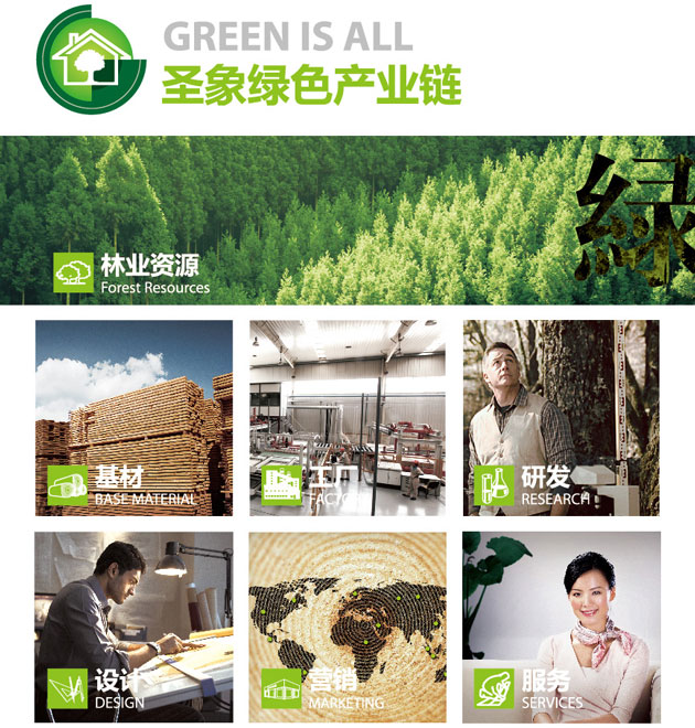 圣象綠色產(chǎn)業(yè)鏈?zhǔn)鞘ハ笃放谱钪匾钠髽I(yè)戰(zhàn)略之一,也是圣象長期引以為榮并長期堅持恪守的綠色方案和發(fā)展根基。圣象將可持續(xù)發(fā)展理念縱向貫通于產(chǎn)業(yè)鏈上下游,涵蓋林業(yè)資源、基材、工廠、研發(fā)到設(shè)計、營銷、服務(wù)7大環(huán)節(jié),形成一個全面完整的品質(zhì)質(zhì)控體系。