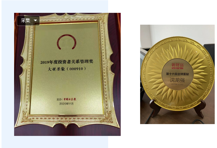 同時(shí),大亞圣象董秘沈龍強(qiáng)于2020年11月20日獲得第十六屆新財(cái)富“金牌董秘”殊榮。上市公司和董秘同時(shí)獲得資本市場(chǎng)最具權(quán)威的兩個(gè)獎(jiǎng)項(xiàng),反映出資本市場(chǎng)對(duì)上市公司在公司治理、信息披露、優(yōu)秀投資者關(guān)系管理等方面的充分肯定,公司將會(huì)再接再厲,砥礪前行,用業(yè)績(jī)回報(bào)廣大投資者。